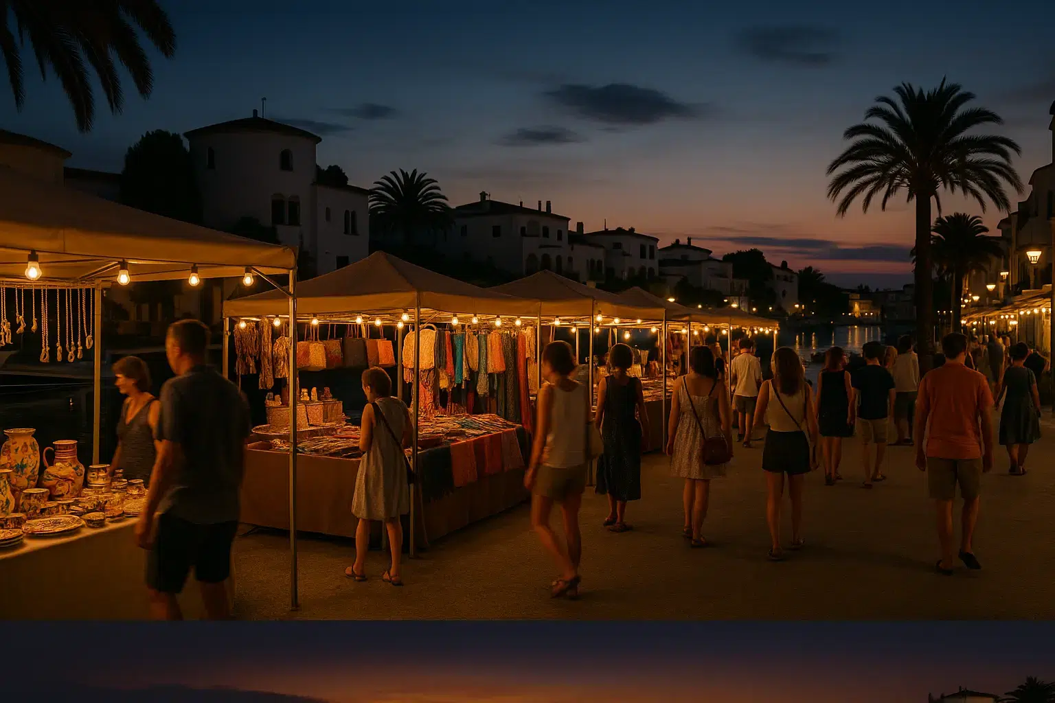 À la tombée de la nuit, le marché d’Empuriabrava se métamorphose en un lieu féérique. Chaque jour de juillet et août, la promenade en bord de mer s’illumine sous les guirlandes de lampions. La musique douce emplit l’air, tandis que le murmure des vagues accompagne les pas des flâneurs. Ici, le temps semble suspendu, entre le ciel étoilé et la mer Méditerranée.